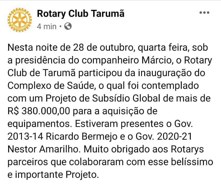 “Ressalto o comprometimento e trabalho dos companheiros do Rotary Club de Tarumã, que realizam o sonho proposto, há 12 anos, em edificar e equipar um complexo de saúde para a sua comunidade”, finalizou Bermejo.