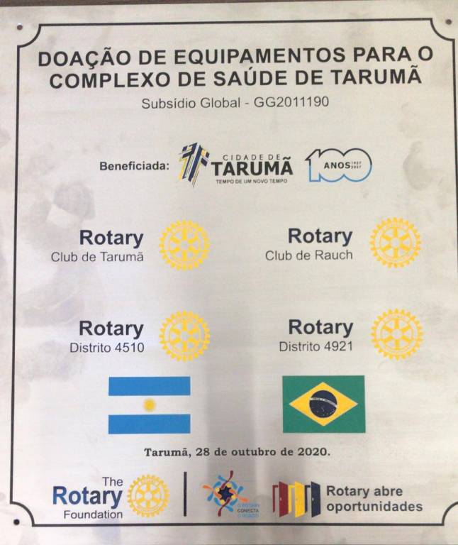 Contando com a presença de lideranças rotárias, entre elas o Governador do Distrito, Nestor Silveira do Amarilho, além de autoridades municipais, regionais e estadual, o Rotary Club de Tarumã, Distrito 4510, em parceria com o Rotary Club de Rauch, Argentina, Distrito 4921, fez a entrega nesta quarta-feira (28) de equipamentos adquiridos através do projeto de Subsídio Global aprovado junto a Fundação Rotária, ao Complexo da Saúde de Tarumã.